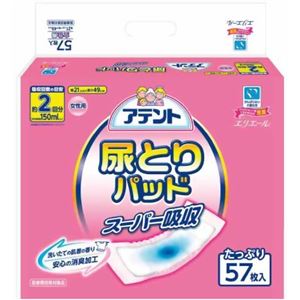 こちらの商品には必ずご注文明細が同梱されます。恐れ入りますが明細書不要の対応ができかねますので、ギフト用にご注文される場合にはご注意ください。「アテント 尿とりパッド スーパー吸収 女性用 2回吸収 57枚入」は、安心の二層構造の吸収体でおしっこ約2回分をしっかり吸収する尿とりパッドです。安心の長さ49cm、ズレ止めテープ付きで動いてもズレにくく、安心です。さらさら感続く二層構造の吸収体で、尿が逆戻りしにくく、お肌はさらさら快適です。安心の消臭加工・洗いたての肌着の香り。吸収回数の目安:約2回分(1回の排尿量150mlとして)。医療費控除対象商品。